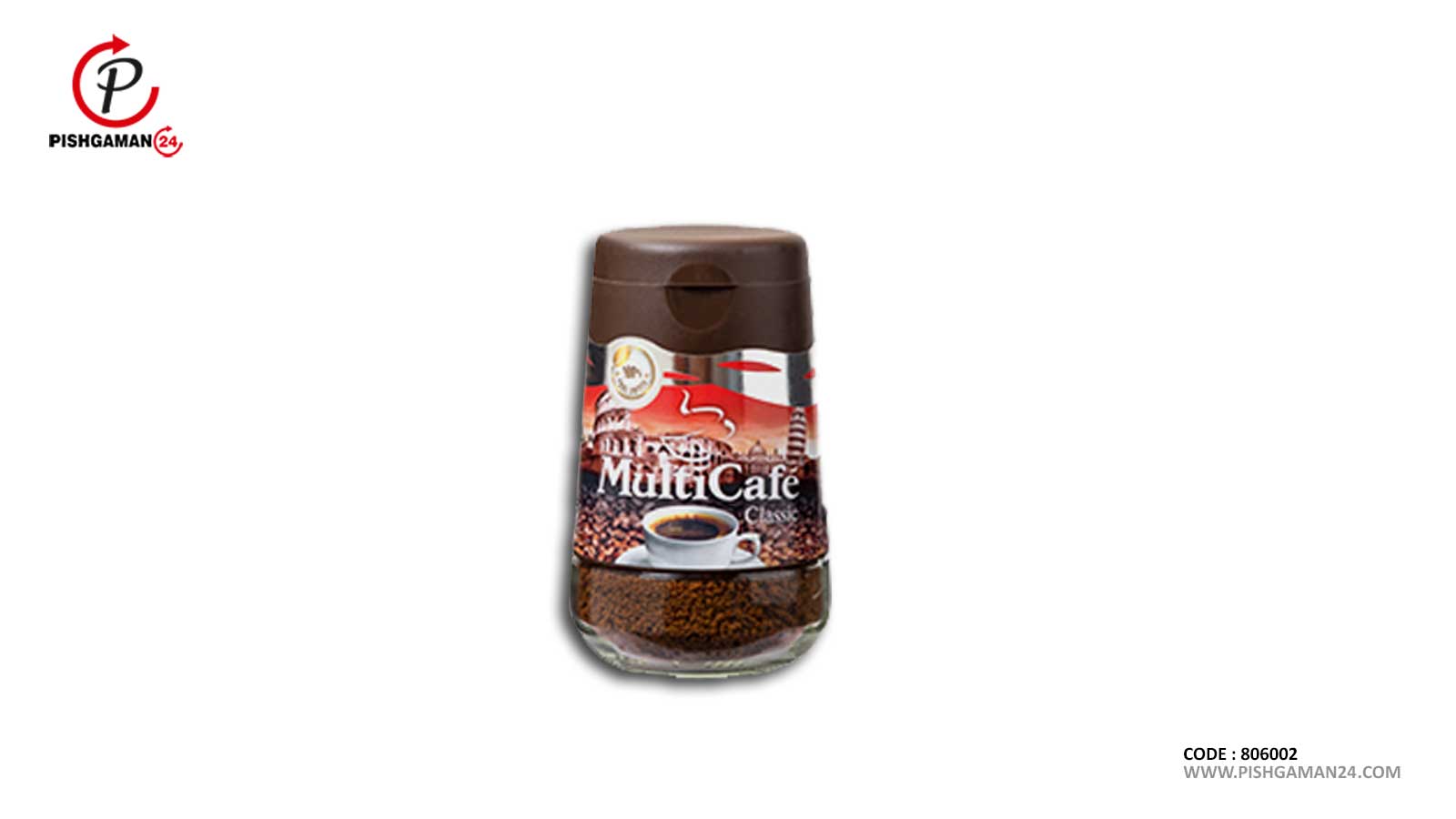 قهوه فوری کلاسیک فوق یکی از محصولات تولیدی با برند مولتی کافه میباشد. از اواخر دهه 90 با ایجاد نخستین کارخانه تولید شیر خشک غنی شده کودک، در خاورمیانه آغاز بکار کرد. اولین کارخانه قهوه فوری ( کافی میکس ، کاپوچینو ، شکلات داغ ) در ایران را احداث نمود. محصولات مولتی کافه از مرغوب ترین دانه های سبز قهوه با برترین تکنولوژی روز دنیا تولید میشود. اقداماتی از قبیل پاکسازی دانههای قهوه سبز ، برشتگی ، آسیاب ، عصاره گیری و تغلیظ برای تولید پودر قهوه فوری انجام میشود. محصولات تولیدی شامل انواع قهوه ، کافی کریمر ، کافی میکس ، کاپوچینو و همچنین شکلات داغ میباشد. قهوه فوری کلاستیک از مرغوبترین دانههای قهوه تولید میشود، که رایحهای به یاد ماندنی و طعمی دلچسب دارد. این محصول در شیشه 100 گرمی و کارتنهای 4 عددی، جهت ارائه به بازار عرضه میگردد.
